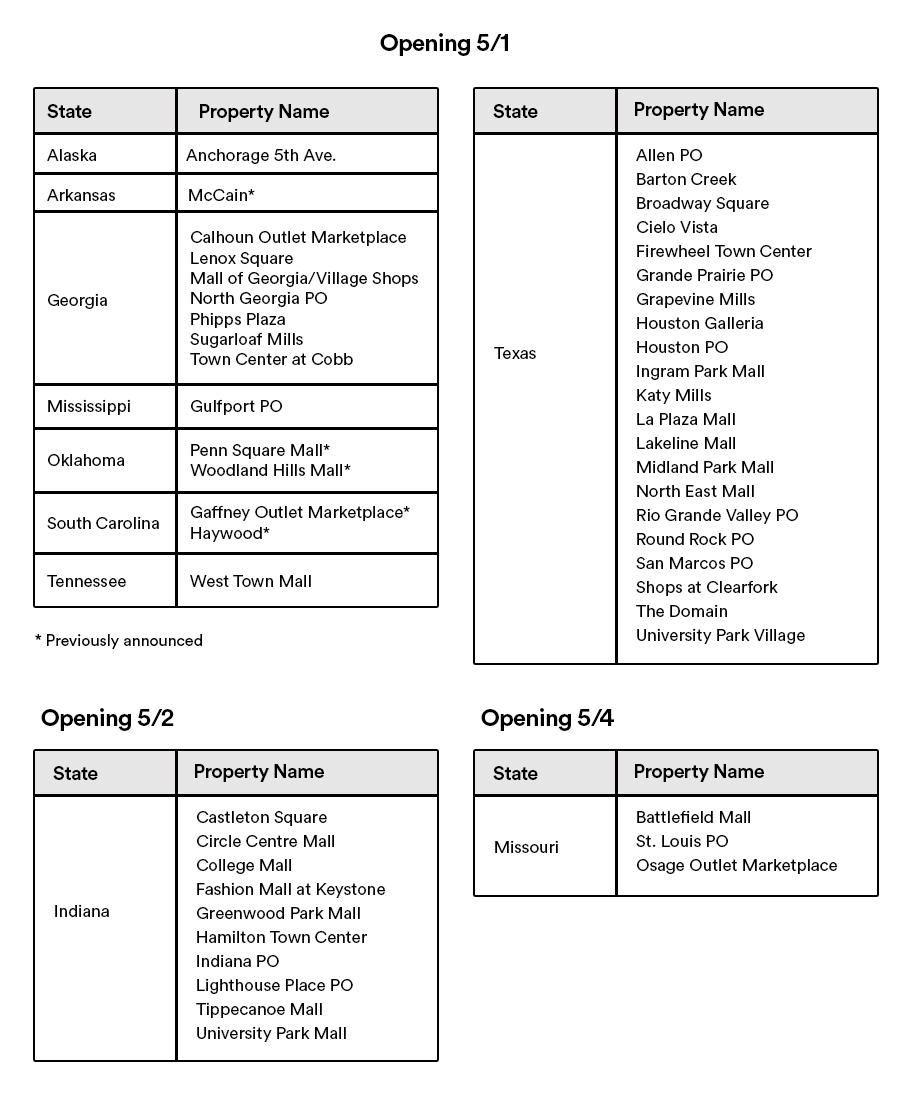 • Enhanced Sanitizing and Disinfecting. Each night, the common area of the property will be thoroughly sanitized and disinfected using products that meet or exceed CDC guidelines. Each retailer should do the same for their store. Additionally, during mall hours, we will regularly sanitize and disinfect high touchpoint areas, including restrooms, seating areas, escalator/stair handrails, trash bins, door knobs and handles, directories, food court tables and chairs, etc. Each tenant should perform the appropriate cleaning of their space